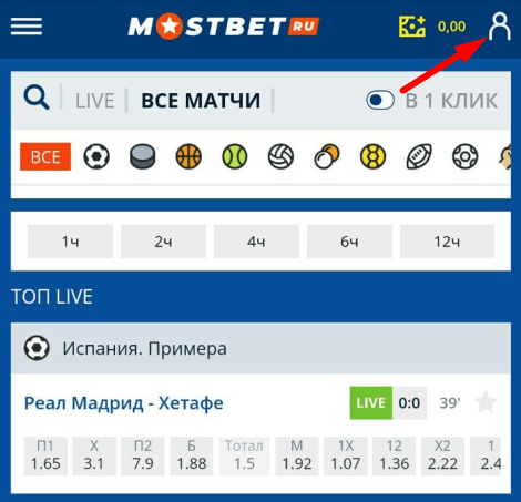 На мобильной версии сайта букмекерской компании войдите в личный кабинет, указав номер телефона и пароль. Вверху кликните по иконке профиля.